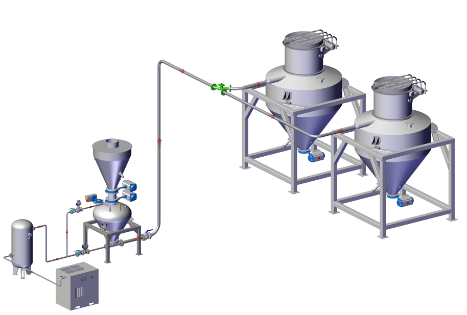 正壓密相輸送系統(tǒng)采用壓縮空氣作動(dòng)力源傳輸物料。采用強(qiáng)制性氣力輸送,依靠密閉壓力容器(發(fā)送罐)作發(fā)送器,一般氣源壓力為0.5 Mpa~0.7Mpa,運(yùn)行壓力0.3~0.5Mpa,發(fā)送罐只能采取間隙性輸送方式,輸送路程可達(dá)1000m以上。物料在管道內(nèi)以較低速度、沙丘狀態(tài)、流態(tài)化或團(tuán)聚狀態(tài)輸送的方式稱(chēng)為正壓密相輸送。